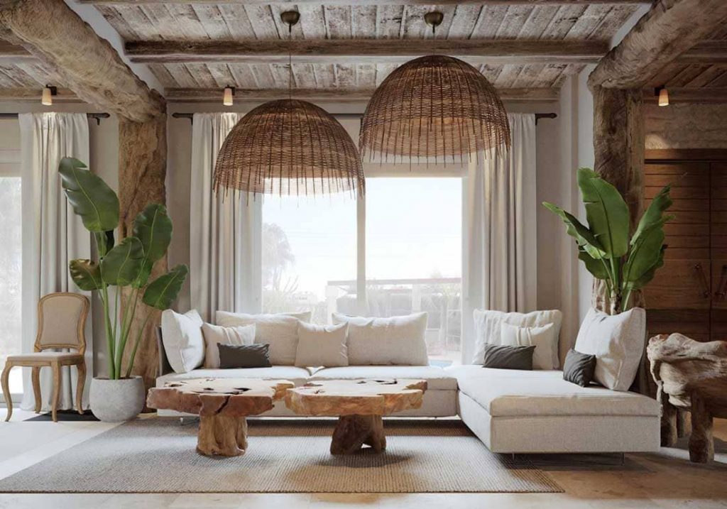 Nội thất trang trí tạo điểm nhấn cho phong cách Địa Trung Hải đó chính là thảm sàn và đèn treo trần. Thảm sàn tượng trưng cho mặt đất và bóng đèn tượng trung cho ánh mặt trời, đây là một chi tiết hay tôi rất thích chi tiết này. Lồng ghép yếu tố thiên nhiên vào không gian: cây xanh, chậu hoa,…